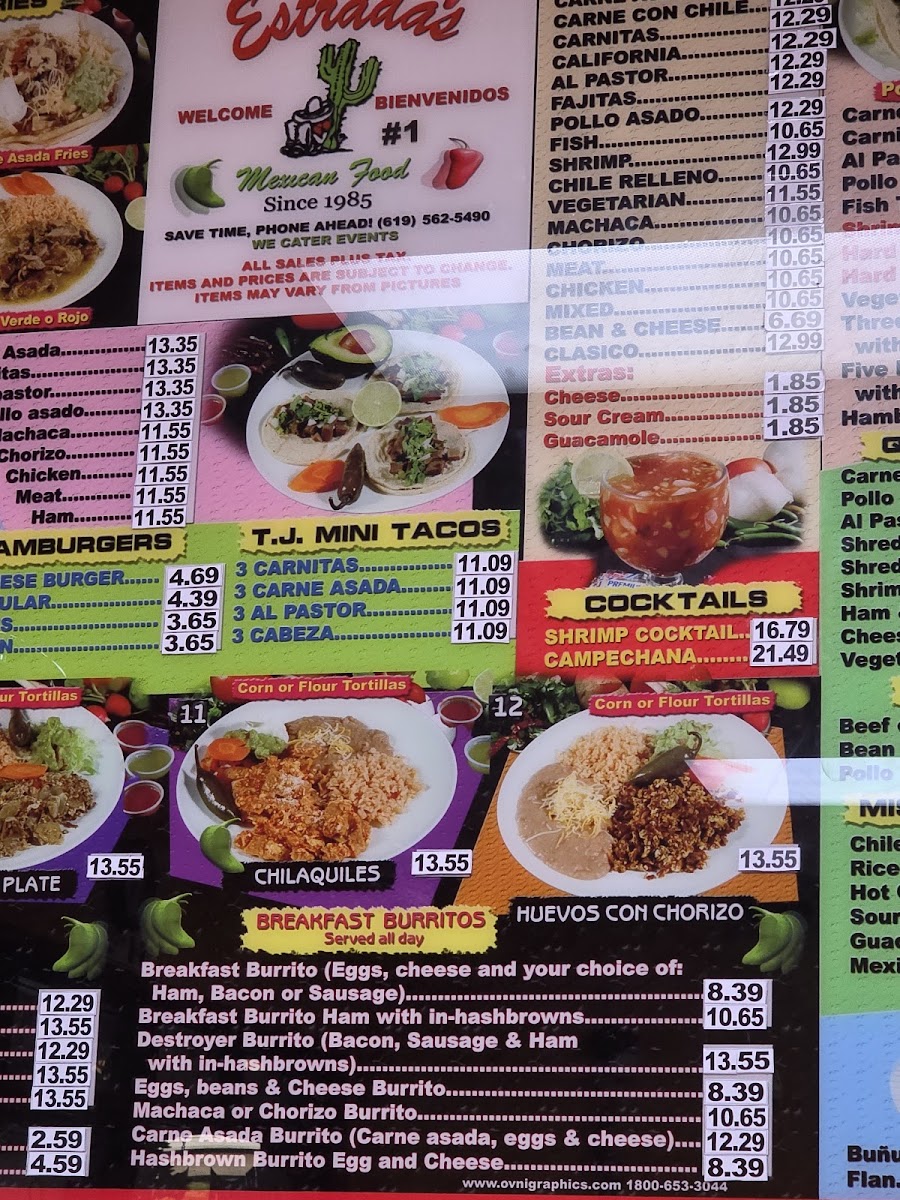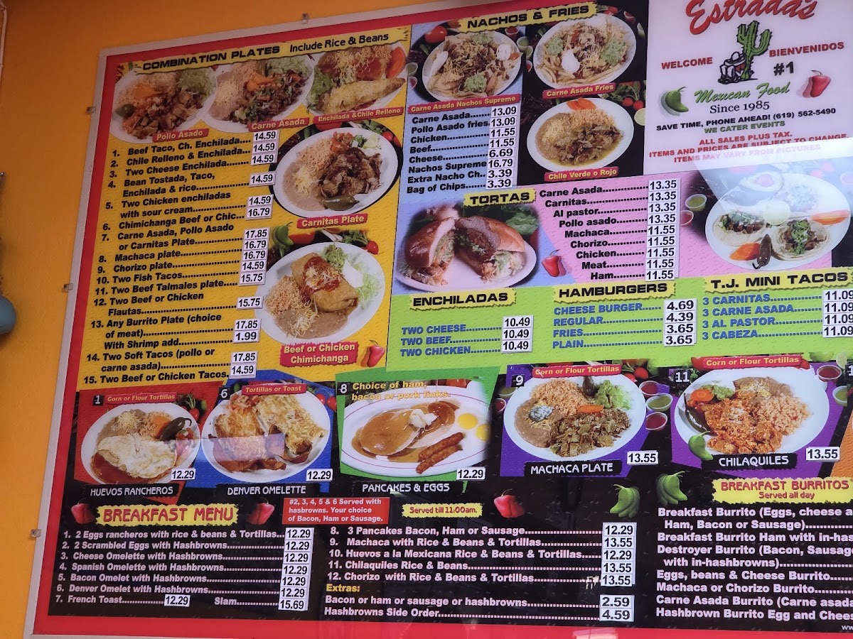 Menu highlights include several burrito offerings such as the breakfast burrito, California burrito, and carne asada burrito served with American-style guacamole and sour cream. These items are commonly ordered for a quick meal option.