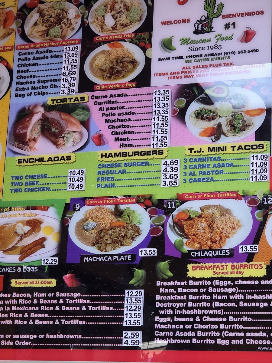 The menu offers a variety of traditional Mexican and fast food options, suitable for breakfast, lunch, or casual dining. It is structured into several key sections to help visitors quickly find their preferred dishes.